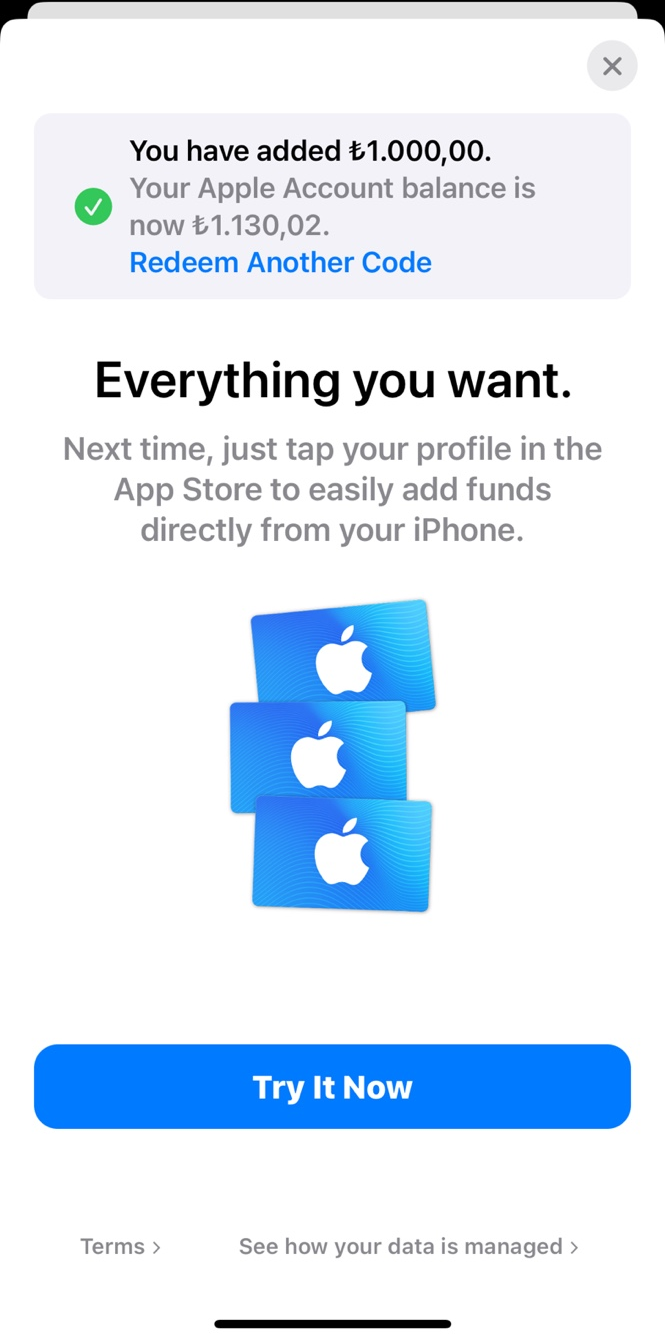 계속 충전하기 귀찮아서 이번에는 1000리라 기프트카드를 구매해 보았다.